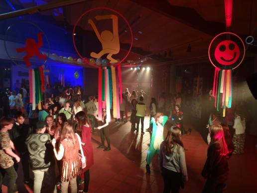 Party war angesagt an der Mittelschule Cadolzburg. Am Donnerstag, 16. Februar, feierten unsere Mittelschüler Fasching unter dem Motto „Wir sind bunt – die Hippies sind zurück!“. Insgesamt 300 Schüler/innen, darunter etwa ein Drittel aus unserer Verbundschule Langenzenn/Veitsbronn, trafen sich ab 18 Uhr in der im Stile der 68er geschmückten Aula der Mittelschule. Den ganzen Tag über hatten dazu viele Schüler/innen unter der Leitung von Fachlehrerin Alexandra Schott zusammengeholfen und eifrig dekoriert.